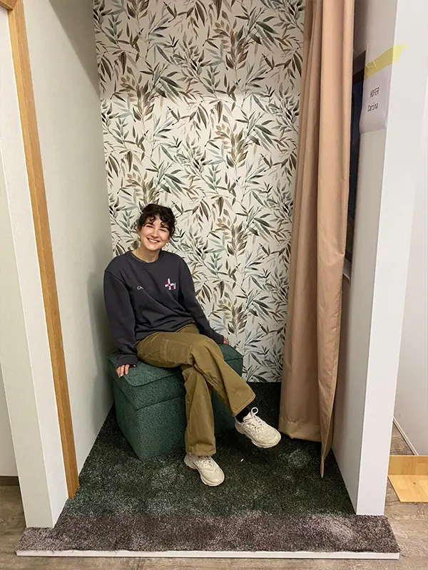 Eine Musterkoje wurde tapeziert, neue Vorhänge gefertigt, ein Teppich mit Bordüre verlegt sowie ein Hocker komplett neu angefertigt!